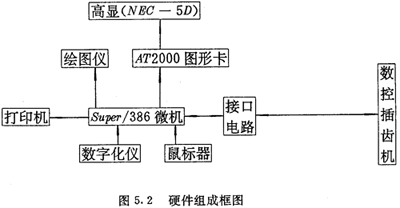 本系統(tǒng)是在一臺微型計算機super/386基礎上,增加一塊選進的圖形卡,一臺高分辨率顯示器,數(shù)控接口電路及相應設備,組成了一個微機工作站,如圖5.2所示。
