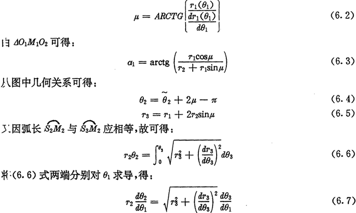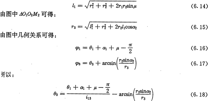 假設圖6.4中O1、M1、M2三點始終都能保持在同一直線上,則對于太陽輪轉角φ1,圖6.4中的α2可根據(jù)圖6.3中的行星輪轉角θ2求得,由圖中幾何關系及(6.4)式應有