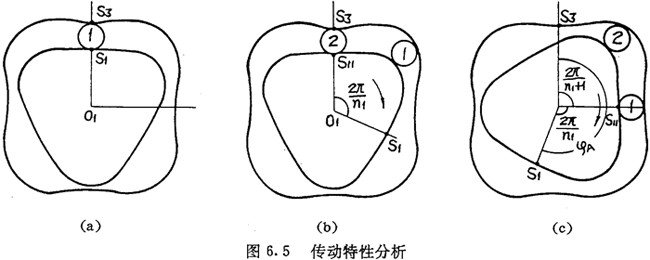 固定內齒圈,當太陽輪起點從初始位置開始轉動到與行星輪重新在初始位置接觸時,太陽輪轉過的圈數(shù)與行星輪公轉過的圈數(shù)之比ip12稱作太陽輪與行星輪的均傳動比。圖6.5(a)為初始位置,圖6.5(c)為太陽輪按順時針方向相對行星輪1轉過一個周期后的情形。此時內齒圈相對該行星輪也應轉過一個周期,即行星輪1從初始位置公轉過的角度為:
