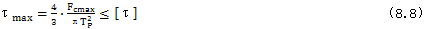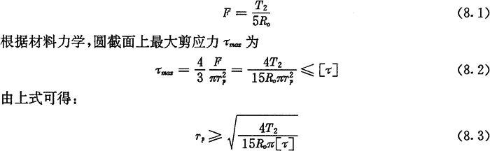 將上述所得基本設(shè)計參數(shù)的值代入式(7.70)并求最大值可得Fcmax=1082.5(N),將其代入式(8.8)得τmax=28.69(N/mm2),小于所選軸銷的許用接觸應(yīng)力,故滿足設(shè)計要求。