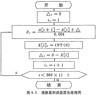 用式(4.4)及式(4.5)計算nx和nc時,得到的不可能恰好是整數(shù),為了消除累積誤差,每段中應(yīng)把上一段的誤差考慮進(jìn)去。例如對nx的計算,假定表8.1中ρd的360×11個數(shù)已存在數(shù)組A中,計算后的360×11-l個脈沖數(shù)nx存在數(shù)組x中,則計算過程如圖8.3所示。