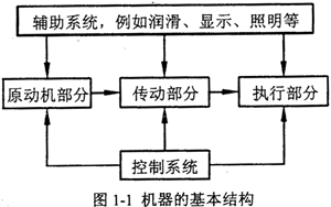 機器的發(fā)展經歷了一個由簡單到復雜的過程,人類為滿足生產及生活的需要,設計和制造出了種類繁多、功能各異的機器。機器類型多種多樣,基本結構可以歸結為如圖1-l所示。機器的功能各異,所要求的運動形式千變萬化,并且需要克服的阻力、阻力矩也因機器工作情況而異。一般說來,原動機的運動形式、運動及動力參數都是有限的,而且是確定的。這樣必須解決把原動機的運動形式、運動及動力參數轉變?yōu)閳?zhí)行部分所需的運動形式、運動及動力參數的問題。這就必須靠機器的傳動部分來完成,即機器中的傳動部分是機器為完成各種功能所必需的基本構成。
