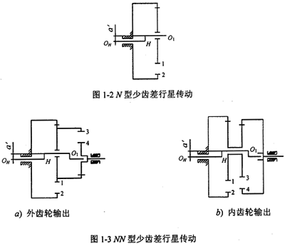本文所研究的三環(huán)減速機傳動屬于漸開線少齒差傳動,故有必要對漸開線少齒差傳動進行深入的探討。對于標準漸開線內嚙合行星齒輪傳動,當其中心內齒輪2和行星外齒輪l的齒數差小于8時,即zp=z2-z1<8(z2=78~200),則該內嚙合齒輪副就會產生過渡曲線干涉和齒廓重迭干涉。為了避免內嚙合齒輪傳動的各種干涉,可以采取變位的內嚙合齒輪傳動,但是采取變位齒輪傳動要保證內、外齒輪的齒頂不得變尖,要有足夠的厚度。漸開線少齒差行星傳動,就是由齒數差很。ㄒ话銁p=1~4)的漸開線內嚙合變位齒輪副組成的K-H-V(N)型傳動或ZK-H(NN)型傳動。中心輪代號K,轉臂代號H,輸出構件代號V。N型少齒差傳動示意圖如圖1-2所示,圖中1為行星外齒輪,2為中心內齒輪,H為輸入軸,又稱為轉臂。行星輪1裝在有偏心距a′的輸入軸上,當輸入軸旋轉時,行星輪不僅繞其安裝在H上的軸線O1轉動,且同時隨著H繞著固定的軸線OH回轉,即行星輪的軸線O1在半徑等于偏心距的a′一個圓周上運動;NN型少齒差行星傳動示意圖如圖1-3所示,內齒輪2固定不動,H為輸入軸,又是轉臂,行星輪1和3是一個整體,裝在有偏心距a′的輸入軸H上,當輸入軸旋轉時,行星輪不僅繞其安裝在H上的軸線O1轉動,并且同時隨H繞著固定的軸線OH回轉,然后通過齒輪3帶動齒輪4轉動,而齒輪4與輸出軸固定在一起,把運動輸出。