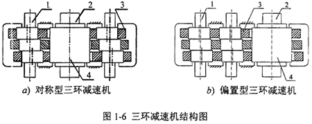 由于三環(huán)減速機(jī)的研究歷史較短,作為一種新生事物,它的發(fā)展道路也必定是曲折的。我國(guó)生產(chǎn)的三環(huán)減速機(jī)的結(jié)構(gòu)如圖1-6所示,a)是對(duì)稱(chēng)型三環(huán)減速機(jī),b)是偏置型三環(huán)減速機(jī),三環(huán)減速機(jī)由兩根高速偏心輸入軸1,低速輸出軸2,三片為齒環(huán)板3和外齒輪4構(gòu)成。三片內(nèi)齒環(huán)板3偏心安裝在兩根高速軸1上,它們都與外齒輪4相嚙合,外齒輪4安裝在輸出軸上,各軸均平行配置,利用三相并列平行雙曲柄機(jī)構(gòu)來(lái)克服死點(diǎn)。雙曲柄機(jī)構(gòu)的最大缺點(diǎn)就是存在死點(diǎn)位置,即當(dāng)曲柄與連桿共線時(shí),機(jī)構(gòu)處于運(yùn)動(dòng)不確定位置,此時(shí)傳動(dòng)角為零,機(jī)構(gòu)無(wú)法運(yùn)動(dòng),因此必須采取雙曲柄軸動(dòng)力輸入、多相并列雙曲柄機(jī)構(gòu)和多曲柄機(jī)構(gòu)來(lái)克服死點(diǎn)。