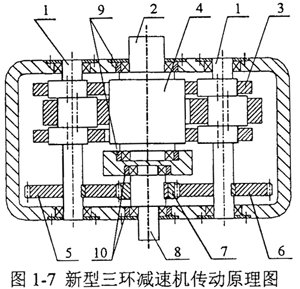 本文對(duì)三環(huán)減速機(jī)的平衡、均載減振方面進(jìn)行了深入細(xì)致的研究,并在此基礎(chǔ)上,提出慣性力、慣性力偶矩理論上完全平衡的兩級(jí)三環(huán)減速器一中間環(huán)板的厚度是兩側(cè)環(huán)板厚度的兩倍,并且它們偏心之間的相位差為180°;它的傳動(dòng)原理如圖1-7所示,三環(huán)減速器二級(jí)傳動(dòng)由兩根高速偏心輸入軸1,低速輸出軸2,三片內(nèi)齒環(huán)板3和外齒輪4構(gòu)成。為了克服偏心輸入軸的死點(diǎn)位置和增大傳動(dòng)比和降低二級(jí)輸入軸的轉(zhuǎn)速,一級(jí)傳動(dòng)采用分流定軸齒輪5、6分別帶動(dòng)兩個(gè)偏心輸入軸,而齒輪5、6則由一級(jí)輸入軸上的主動(dòng)齒輪7帶動(dòng)。三個(gè)內(nèi)齒環(huán)板都與外齒輪4相嚙合。在三環(huán)減速器的輸出軸2以及一級(jí)輸入軸8的軸承外圈和軸承座孔之間裝有輸出軸彈性均載環(huán)9和輸入軸彈性均載環(huán)10,彈性均載環(huán)的變形使輸出軸和一級(jí)輸入軸上的外齒輪浮動(dòng),補(bǔ)償制造安裝誤差和傳動(dòng)變形,從而實(shí)現(xiàn)三環(huán)減速器的均載和減振。對(duì)未加裝均載裝置的兩級(jí)三環(huán)減速機(jī)(以下簡(jiǎn)稱(chēng)原型機(jī))和加裝均載裝置的兩級(jí)三環(huán)減速機(jī)(以下簡(jiǎn)稱(chēng)改進(jìn)型機(jī))進(jìn)行傳動(dòng)性能、受力性能、均載和減振實(shí)驗(yàn),驗(yàn)證均載和減振效果,證實(shí)本文的三環(huán)減速機(jī)的優(yōu)越性。