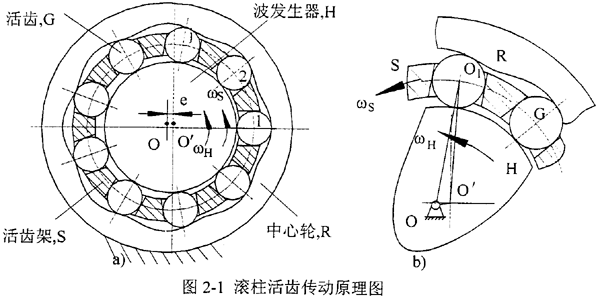 滾柱活齒傳動系統(tǒng)(見圖2-la)主要由波發(fā)生器H、活齒G、活齒架S、中心輪R四個部分組成。如圖2-lb所示,滾柱活齒傳動系統(tǒng)在工作時,輸入驅動力后,輸入軸以等角速度ωH,逆時針旋轉,從而帶動波發(fā)生器使其幾何中心O′繞旋轉中心O以同樣角速度旋轉,波發(fā)生器半徑變化的輪廓曲線產生徑向推力,迫使與中心輪工作齒廓接觸的諸活齒,在沿活齒架徑向導槽移動的同時,沿著中心輪工作齒廓滑滾,并通過活齒架的徑向導槽推動活齒架以勻速ωS逆時針轉動,于是滾柱活齒傳動完成了輸入速度ωH、輸出速度ωS的轉速變換運動。而與中心輪非工作齒廓接觸的諸滾柱活齒,在活齒架徑向導槽推動下,順序地返回到導槽內工作起始位置,從而分別完成了各自的運動循環(huán)。