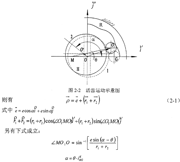(圖2-2) ,波發(fā)生器H勻速逆時針旋轉,設活齒在波發(fā)生器上作純滾動并在中心輪齒廓限制下推動活齒架作勻速逆時針轉動。波發(fā)生器H 的幾何中心為O′,活齒G 的幾何中心為O1。在矢量ΔO O′O1中,矢量