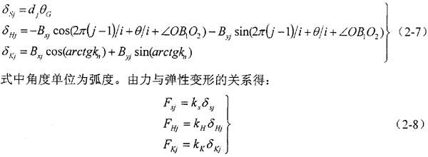 考慮變形協(xié)調條件,設第j個活齒的接觸變形量分別為δHj,δKj和δSj,導致活齒中心與旋轉中心O的連線OB1轉過微小角度θG,反映在坐標系中,就是活齒中心B在水平和垂直兩方向微小的位移Bxj和Byj,可列: