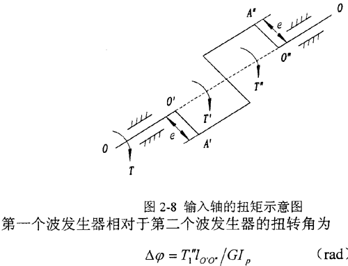 在實際應用中,為平衡掉負載對支承的徑向作用,一般采用180°對稱布置的雙排結構,兩排活齒共用一個活齒架。圖2-8 中O′a′、O″A″分別表示第一排、第二排波發(fā)生器的偏心距。在以下分析中約定:上角標“′”表示第一排活齒傳動的參數(shù),上角標“″”表示第二排活齒傳動的參數(shù)。T1、T1′和T1″分別表示輸入軸上的總輸入力矩、第一和第二個波發(fā)生器分擔的輸入力矩。在輸入力矩的作用下,輸入軸和波發(fā)生器發(fā)生扭轉變形使兩波發(fā)生器的相位差由理論的180°有了一個相對的變化△φ,從而使兩排活齒的受力情況略有不同,所承擔的扭矩也不同。為此,引入載荷傳遞不均勻系數(shù)Kp,設第二排活齒傳遞的扭矩為KpT2,則第一排活齒傳遞扭矩為(l-KP)T2,其中T2為輸出軸上輸出的總扭矩。