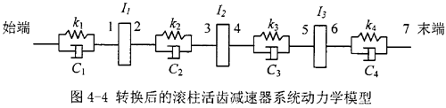 根據(jù)上述方法,可以初步建立起如圖4-3所示的系統(tǒng)動力學(xué)模型,為了能夠利用傳遞矩陣法對該系統(tǒng)進行動力學(xué)分析,需將各慣性元件和彈性元件向輸入軸轉(zhuǎn)換(也可向輸出軸或中間任一軸轉(zhuǎn)換,均不影響結(jié)果),構(gòu)成單一軸線的當量圓盤系統(tǒng)的扭振動力學(xué)模型。轉(zhuǎn)換中,按轉(zhuǎn)換前后系統(tǒng)的動能和勢能保持不變的原則,確定轉(zhuǎn)換后動力學(xué)模型中各元件的參數(shù)。