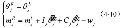 如圖4-5 所示,第j個慣性元件的轉(zhuǎn)動慣量為Ij,所受到的激振力矩為wj(t),旋轉(zhuǎn)阻尼為Cj。元件左側(cè)的狀態(tài)矢量為轉(zhuǎn)角θLj和扭矩mLj,右側(cè)的狀態(tài)矢量為轉(zhuǎn)角θRj和扭矩mRj。元件動態(tài)載荷為慣性力矩Ijθ&&j和外阻尼力矩Vjθ&j。根據(jù)力平衡關(guān)系可得