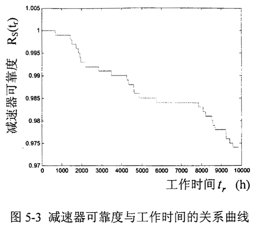 通掃故障樹2000次,產(chǎn)生減速器壽命抽樣值2000個,設(shè)系統(tǒng)最大工作時間Tmax為1000h,考察減速器在工作8760h的可靠度。將Tmax分為1000個區(qū)間,統(tǒng)計減速器壽命抽樣落入各區(qū)間的次數(shù),得到減速器可靠度的仿真值與工作時間的關(guān)系曲線如圖5-3所示。由式(5-13)~(5-20)求得減速器的其他可靠性指標(biāo)如表5-3和表5-4所示。
