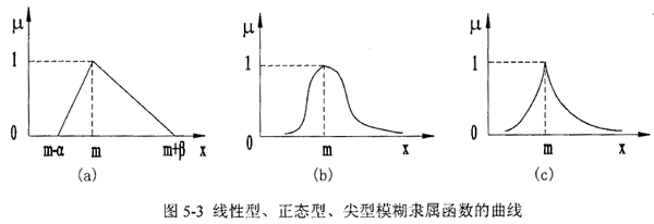 線性型參照函數(shù)在“完全屬于”和“完全不屬于”之間的中介狀態(tài)是線性變化的(見圖5-3a),當(dāng)x≤m-α和x≥m+β時,μ=0,說明在(m-α, m+β)區(qū)間之外的數(shù)值完全不屬于該模數(shù)數(shù),而其他類型的隸屬函數(shù)曲線兩端延伸到無窮遠(圖5-3b,c),說明整流器個數(shù)軸上的任何數(shù)總在一定程度上隸屬于該模數(shù)數(shù)。在選擇參照函數(shù)時,除非有絕對的擾握認(rèn)為該事件發(fā)生的概率在某個范圍之間而選擇線性參照函數(shù),否則,以選取正態(tài)型或尖型為好。