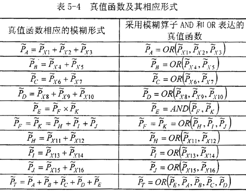 在建立的滾柱活齒減速器故障樹中,用模糊算子AND和OR描述其本事件之間的邏輯關(guān)系。生成真值函數(shù)的模糊形式及采用模糊算子表達的形式見表5-4。根據(jù)模糊數(shù)據(jù)的運算法則式(5-25)、(5-26)和模糊算子AND和OR的計算方法式(5-28)、(5-30)即可確定頂事件發(fā)生的模糊概率。