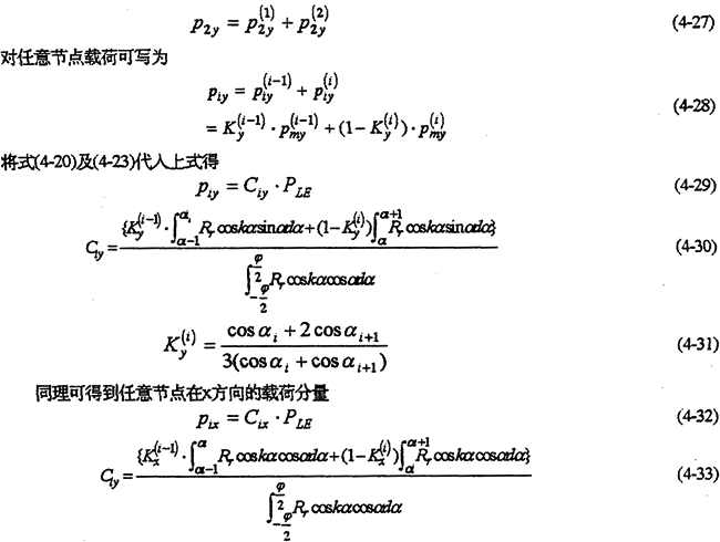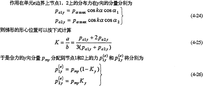對于邊界上每一個微段,按上述方法計算完后,再對每一個邊界點處的力求和即得到邊界節(jié)點沿y向的載荷分量(圖4-6(b))。例如,對于邊界節(jié)點2,其節(jié)點載荷P2y為