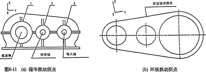 為了將理論分析的結(jié)果與振動(dòng)測(cè)試分析結(jié)果對(duì)比印證,將測(cè)點(diǎn)選在三個(gè)箱體軸承座及齒板支承軸孔的上邊緣,如圖6-11所示。