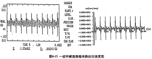 2。圖6-14是輸入軸軸承座的實(shí)測(cè)振動(dòng)加速度時(shí)域曲線及其頻譜分析圖。從加速度譜圖中看出,第一譜峰的頻率值為33.75Hz,恰好是輸入軸轉(zhuǎn)頻的二倍,也是死點(diǎn)沖擊頻率。死點(diǎn)沖擊是一周兩次,其頻率為33.4Hz,這說(shuō)明理論計(jì)算的結(jié)果完全可靠;第二譜峰的頻率值為16.87Hz,與齒板轉(zhuǎn)頻(輸入軸頻率)相近,是齒板的穩(wěn)態(tài)振動(dòng)頻率;第三譜峰的頻率值為49.55Hz,是三環(huán)減速器的嚙合頻率(50Hz),第四譜峰的頻率值為99.50Hz,是死點(diǎn)的嚙合沖擊頻率。圖6-15是某單齒環(huán)內(nèi)齒行星齒輪減速器的軸承座振動(dòng)加速度的實(shí)測(cè)及理論計(jì)算曲線圖。從圖可以看出理論和測(cè)試的分布規(guī)律極為相似。圖中一個(gè)周期有一次較大的加速度沖擊峰,是由于行星齒板過(guò)180°死點(diǎn)時(shí)產(chǎn)生的嚙合沖擊。