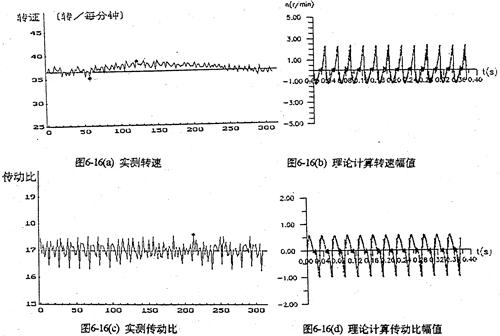 由于機(jī)構(gòu)的變形及誤差等原因,將使輸出轉(zhuǎn)速及傳動(dòng)比動(dòng)變化,沖擊箱體、產(chǎn)生振動(dòng)。圖6-16是對(duì)SHLEO15型三環(huán)減速器實(shí)測(cè)及理論計(jì)算的轉(zhuǎn)速和傳動(dòng)比隨時(shí)間變化的波動(dòng)曲線。輸出轉(zhuǎn)速對(duì)比為