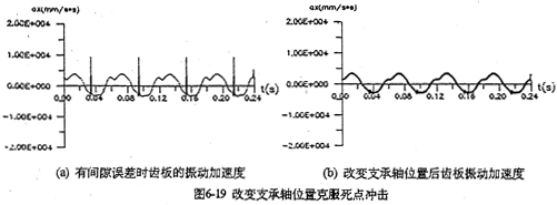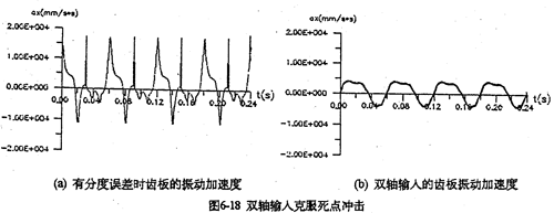 采用雙軸輸人的齒板及箱體軸承座振動(dòng)速度、加速度如圖6-17所示。從圖看出齒板速度及加速度值明顯變。閱屋S輸人時(shí)的0.3倍),而且無(wú)沖擊,完全屬于穩(wěn)太振動(dòng)。箱體的振動(dòng)速度及加速度幅值只是單軸輸人時(shí)的0.2倍。圖6-18a是一軸的偏心套存在0.05度的分度誤差時(shí)齒板的加速度曲線圖,圖中明顯出現(xiàn)加速度沖擊棒線。采用雙軸輸入后,死點(diǎn)沖擊被徹底(見(jiàn)圖6-18b) , 變成穩(wěn)態(tài)振動(dòng)曲線了。因此,為了減小三環(huán)減速器的振動(dòng),有必要加大三環(huán)減速器的橫向尺寸,在箱體內(nèi)增加一套雙軸輸入的齒輪功率分流機(jī)構(gòu),或者在箱體外另設(shè)計(jì)一套功率分流機(jī)構(gòu),以解決機(jī)構(gòu)過(guò)死點(diǎn)的振動(dòng)問(wèn)題。
