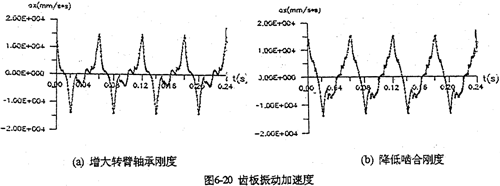 增大行星軸承剛度的目的在于減小雙曲柄機(jī)構(gòu)的變形,降低死點(diǎn)沖擊幅值。并且使各相嚙合力均衡化、減小嚙合沖擊。圖6-20是分別將行星軸承剛度增加一個(gè)數(shù)量級(jí)和內(nèi)齒圈降低一個(gè)數(shù)量級(jí)時(shí)齒板的振動(dòng)加速度。兩者加速度幅值均降低了1/4倍左右。