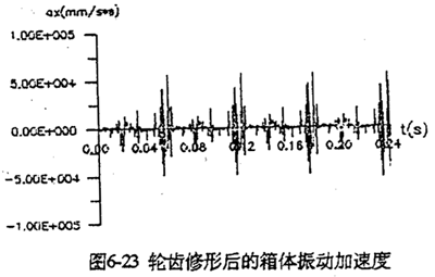 增加高速軸的剛度是降低沖擊載荷的重要途徑。軸的剛度大(值徑大),扭轉(zhuǎn)、彎曲變形小,雙曲柄機(jī)構(gòu)變形也就小,這樣既減小了沖擊振動(dòng)、又增加了軸的強(qiáng)度。圖6-22將高速軸的直徑由原來(lái)的45mm加到55mm后的,振動(dòng)加速度圖。