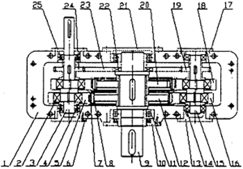 1—箱體,2、4、11、14、22—軸承,3、15—高速軸,5、18—環(huán)板,6、10、13、17、21、25—端蓋,7—針齒,8—滾動(dòng)套,9—低速軸,7、10、20—擺線(xiàn)輪,16—螺針,19、24—小齒輪,23—過(guò)橋齒輪。