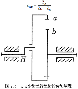 平行軸擺線(xiàn)針輪的基本原理是K-H少齒差行星齒輪傳動(dòng)原理,見(jiàn)圖2.4,它應(yīng)用2.1中結(jié)構(gòu)形式,將平行雙曲柄四桿機(jī)構(gòu)的曲柄,α是連桿內(nèi)齒輪,b是定軸輸出外齒輪。其傳動(dòng)比為: