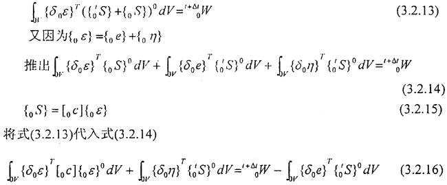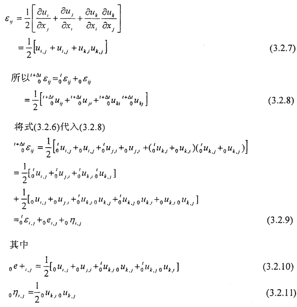 上式是將t+△t時(shí)刻的應(yīng)力、應(yīng)變、位移看成t時(shí)刻已知的應(yīng)力、應(yīng)變、位移和未知增量應(yīng)力{0S},應(yīng)變{0ε},位移{0u}之和,進(jìn)一步,增量應(yīng)變{0ε}可用線性部分即{oε}={oe}+{oη}