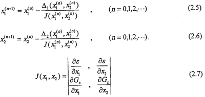 方程組(2.4)的求解,實(shí)際上是兩條限制曲線交點(diǎn)的求法,如圖(2.2)所示。根據(jù)文獻(xiàn),求點(diǎn)X1和X2,用牛頓法迭代,逐步逼近到交點(diǎn)。其迭代程序如下: