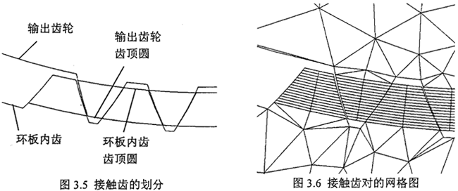 環(huán)板內(nèi)齒輪與輸出軸齒輪之間的傳動是直齒輪傳動,為保證進行接觸計算時,有較多的有較接觸區(qū)域,齒輪輪齒部分的有限元網(wǎng)格采用映射網(wǎng)格劃分法(Mapped Meshing)對齒輪進行有限元網(wǎng)格劃分。同時,為保證兩對嚙合齒輪所劃分的網(wǎng)格接觸對相應(yīng)的面能對應(yīng)齊,因此齒輪嚙合的接觸面相應(yīng)應(yīng)當(dāng)齊整。用輸出軸齒輪的齒頂面所在的輪廓曲面對環(huán)板內(nèi)齒進行劃分(partition 命令),同理用環(huán)板內(nèi)齒的齒頂面所在的輪廓曲面對輸出軸齒輪進行劃分,這樣得到對應(yīng)齊整的齒輪嚙合的接觸面,如圖3.5所示。根據(jù)圖3.5所示,采用映射網(wǎng)格劃分法( Mapped Meshing)進行網(wǎng)格劃分的輪齒部分即是圖中輸出齒輪齒頂圓與環(huán)板內(nèi)齒齒頂圓之間所劃分的部分,而其余部分采用自由網(wǎng)格劃分法(Free Meshing)進行劃分,劃分網(wǎng)格后的部分網(wǎng)格圖見圖3.6所示?紤]實際接觸齒對數(shù)不會太多,所以每塊環(huán)板上只給出6個輪齒進行接觸計算。環(huán)板嚙合的實際過程是環(huán)板齒輪帶動輸出齒輪運動,計算時為方便,假設(shè)環(huán)板固定不動,設(shè)定輸出軸繞軸線轉(zhuǎn)動,將減速器的輸出功率換算為輸出扭矩,加在輸出軸的輸出端。
