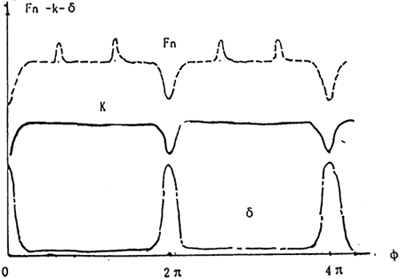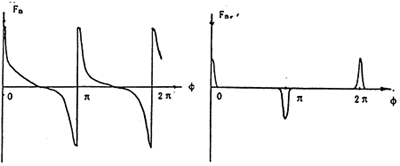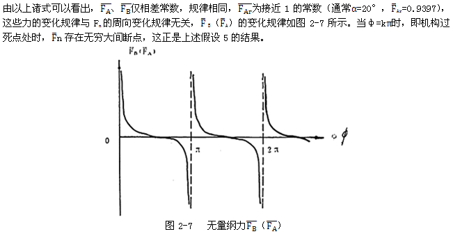 理論上,該力僅在ф=Kπ點(diǎn)產(chǎn)生,而FA、FB將在此點(diǎn)處趨于無(wú)窮大?紤]實(shí)際結(jié)構(gòu)的彈性變形等因素,F(xiàn)Br應(yīng)在ф=Kπ的一轉(zhuǎn)角領(lǐng)域內(nèi)ф=Kπ±△ф產(chǎn)生,而FB、FA在該鄰域內(nèi)由正(或負(fù))向峰值過零轉(zhuǎn)變?yōu)樨?fù)(正)向峰值,如圖2-10所示。這是因?yàn)镕B、FA在死點(diǎn)位置附近迅速增大產(chǎn)生的彈性變形也會(huì)使環(huán)板產(chǎn)生微小反轉(zhuǎn)角度,而導(dǎo)致FBr的產(chǎn)生,顯然該微小角度領(lǐng)域的大小以及FB、FA所能達(dá)到的峰值決于環(huán)板的剛度。剛度越大,該領(lǐng)域越小,F(xiàn)B、FA峰值越大,F(xiàn)Br的大小與嚙合力及無(wú)量綱參數(shù)(γ+β)成正比。一般情況下,高速重載的三環(huán)減速器、環(huán)板機(jī)構(gòu)的剛度嚙合力等均較大,因此死點(diǎn)處受到的沖擊越大,且沖擊脈沖寬度。ǚ幢扔诮撬俣龋ふ耦l率更寬,更易激起廣泛的共振。
