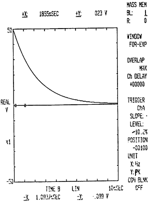 脈沖錘擊信號(hào)送入 CF-355中的S通道,響應(yīng)信號(hào)送入B通道,對(duì)脈沖激勵(lì)所加的力窗函數(shù)及內(nèi)觸發(fā)脈沖的方向、數(shù)值大小及位置如圖4-1示,對(duì)脈沖響應(yīng)所加的指數(shù)窗函數(shù)如圖4-2示。