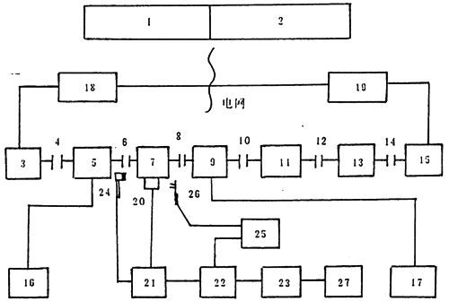 試驗時,通過控制臺1,2調(diào)節(jié)控制系統(tǒng)讓交直流機組18發(fā)出適當?shù)闹绷麟妷菏怪绷鳒y功機3(工作于恒速電動工況)按恒定轉(zhuǎn)速轉(zhuǎn)動,通過聯(lián)軸器4,6和輸入轉(zhuǎn)速扭矩傳感器5與試件7輸放端(高速端)相聯(lián)接。試件7輸出端通過聯(lián)軸器8,10,12,14及輸出扭矩傳感受器9、升速用11、汽車變速箱13而與直流測功機15(工作于恒電流工況)聯(lián)接,驅(qū)使其發(fā)出適當電壓的直流電,再通過交直流機組19將其逆變成為工頻北流電返回電網(wǎng),完成整個電功率封閉閉鏈。