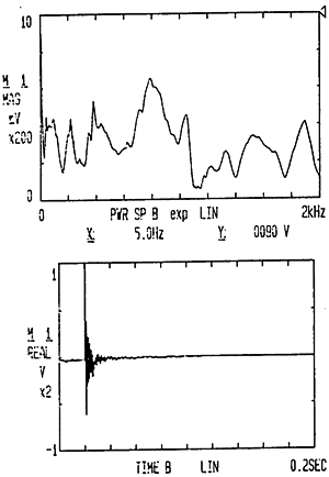 試件7上的振動信號與脈沖激勵的響應(yīng)信號通過傳感器20取出信號,然后經(jīng)過放大器21放大后,用磁帶記錄儀22記錄并可采用頻譜分析儀23監(jiān)控并分析,而其上的噪聲信號可以通過聲強儀25的測頭26取出信號后送入22和23中用于分析研究。