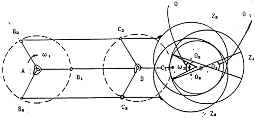 如圖7-1示,三環(huán)減速器三套平面四桿機構(gòu)AB1C1D-01、AB2C2D2-02、AB3C3O3及外齒輪見圖中所示。在圖示位置時,平面四桿機構(gòu)AB1C1D處理死點位置,運動處于不確定運動狀態(tài),由于嚙合力的作用將產(chǎn)和瞬間的沖擊力。為了能除去或減少該沖擊力的作用,我們在一定的角度θ內(nèi)對AB1C1D上的內(nèi)齒輪進行修形,使在死點位置時,平面四桿機構(gòu)AB1C1D不受嚙合力或少受嚙合力作用,這樣,通過其余兩套平面四桿機構(gòu)就能較易將其速成過死點位置,從而達到減不止或消除過死點的沖擊。同樣,對另兩套平面四桿機構(gòu)AB2C2D2及AB3C3O3作同樣的修形。這種方法我們已正在試驗過程中。