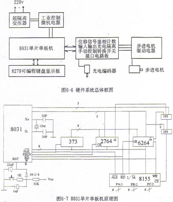 數(shù)控硬件由8031、外擴(kuò)一片程序存貯器芯片2764、外擴(kuò)一片數(shù)據(jù)存貯器6264和外擴(kuò)一片通用可編程并行輸入/輸出接口芯片8155、總線、片選擇碼電路、采用8279芯片的通用鍵盤顯示電路和位移鑒相輸入及驅(qū)動(dòng)輸出的接口電路組成。數(shù)控系統(tǒng)的現(xiàn)場抗干擾性能直接關(guān)系到整個(gè)系統(tǒng)的成敗。在硬件方面,為了防止強(qiáng)電電網(wǎng)的電壓尖峰和毛刺對(duì)系統(tǒng)的干擾,采用抗干擾能力強(qiáng)的工業(yè)用微機(jī)電源、超隔離變壓器、片選法譯碼電路、光電隔離電路。