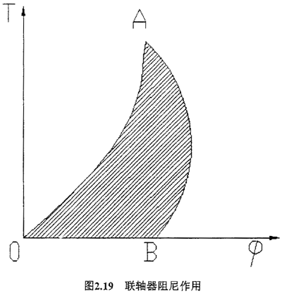 聯(lián)軸器的阻尼作用如圖2.19所示,聯(lián)軸器在工作過程中,加載和卸載的特性線不重合,所包圍的面積,OAB就代表阻尼所消耗的能量。