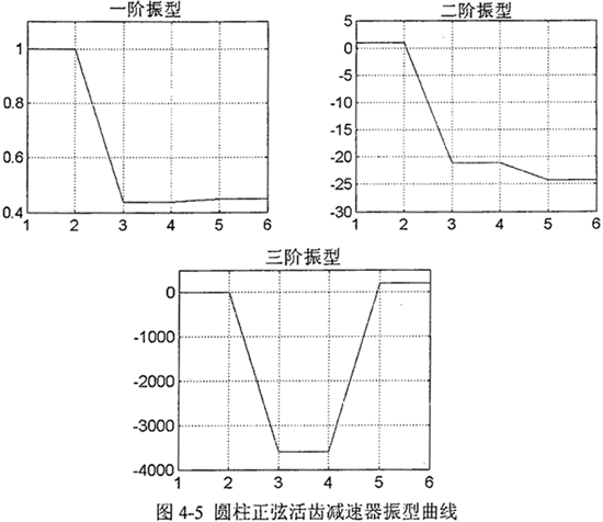 根據(jù)式(4-9)、(4-10)及(4-12)計(jì)算出固有頻率、勢(shì)能分布率和模態(tài)柔度見(jiàn)表4-2。利用Matlab編制程序還繪制出圖4-5所示的減速器系統(tǒng)的振型曲線。