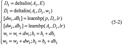 (3)計(jì)算各層反向傳播的誤差變化D1、D2,并計(jì)算各層權(quán)值的修正值及新的權(quán)值: