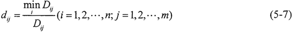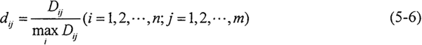 2.求轉(zhuǎn)換樣本矩陣 即象矩陣 由于指標(biāo)不同,要求不同,因此有必要按上限效果測(cè)度、下限效果測(cè)度、中心效果測(cè)度來統(tǒng)一樣本。當(dāng)指標(biāo)要求“越大越好”時(shí),可用上限效果測(cè)度,記統(tǒng)一后的樣本為dij,則有