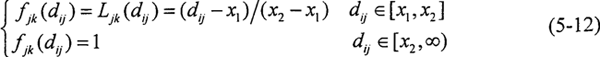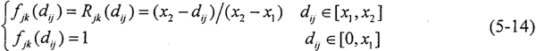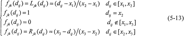 4.進(jìn)行灰色聚類 對(duì)象矩陣進(jìn)行聚類,聚類類別選為“1”、“2”、“3”三類時(shí),其白化權(quán)函數(shù)分別與式(5-12)~(5-14)和圖5-4對(duì)應(yīng)。