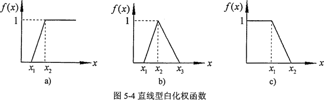 則f(x)稱為典型白化權(quán)函數(shù),稱L(x)為左增函數(shù),R(x)為右降函數(shù),稱[b1,b2]為峰區(qū)。峰區(qū)表示灰量x的最佳程度,即權(quán)為1,稱a為起點(diǎn),c為終點(diǎn),b1、b2為轉(zhuǎn)折點(diǎn),其值稱為轉(zhuǎn)折值或閾值。