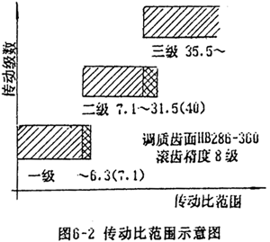 二級以上圓柱齒輪減速器的各級傳動比分配原則,最優(yōu)先是各級傳動承載能力大致相等,其次是使各級大齒輪能夠浸油潤滑,減速器尺寸小,重量較小,各級齒輪圓周速度低,對于系列減速器還要根據(jù)所采用的材質工藝方案,充分考慮零、部件的通用性問題。