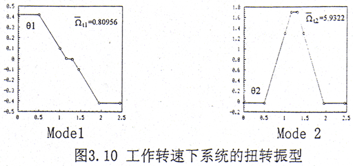 在ka=0.128不計(jì)內(nèi)阻尼時(shí),工作轉(zhuǎn)速下系統(tǒng)的前12階彎曲振動(dòng)復(fù)模態(tài)圖見圖3.9。從復(fù)模態(tài)圖上可以看出,在低階彎曲模態(tài)中,輪齒的變形是較小的,輪齒變形較大主要發(fā)生在高階模態(tài)中。這與實(shí)際情況比較接近,因?yàn)樵趯?shí)際的轉(zhuǎn)子系統(tǒng)中,輪齒的剛度一般比軸段的剛度要大許多,因此在低階的彎曲模態(tài)中,輪齒的變形體現(xiàn)不出來。系統(tǒng)前2階的扭轉(zhuǎn)振型如圖3.10所示。在前二階扭轉(zhuǎn)振型中輪齒變形也較小。