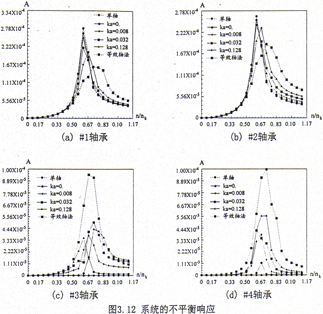 用單軸分析法計算不平衡響應,在#1和#2軸承上產生的振幅最大,等效軸法則最小,而在#3軸承和#4軸承上產生的振幅則正相反。其中用單軸分析法計算不平衡響應,在#3和#4軸承處不產生振動,這與實際情況不符;用等效軸法計算,則明顯夸大了二側轉子的耦合作用,沒有體現(xiàn)出齒輪聯(lián)軸器的特點。因此采用單軸分析方法和等效軸方法計算系統(tǒng)的不平衡響應均存在不小的誤差。通過上面的計算可見,隨著轉角剛度的增大,左側轉子的不平衡量對本身轉子支承軸承所激起的響應幅值明顯減小,對右側轉子支承軸承所激起的響應幅值則明顯增大。