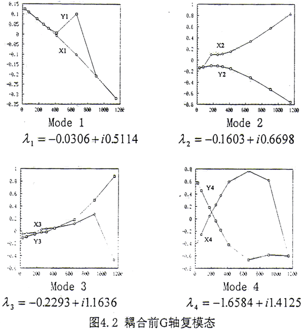 通過齒輪聯(lián)軸器耦合后的轉(zhuǎn)子系統(tǒng),在上述給定的轉(zhuǎn)速范圍內(nèi),共為12階模態(tài),如圖4.4所示,比耦合前多了2階。這表明耦合后在上述轉(zhuǎn)速范圍內(nèi)模態(tài)數(shù)目發(fā)生了變化。耦合系統(tǒng)的模態(tài)可以分為兩類:(1)第一類為耦合成分很小的振動(dòng),例如Mode1、Mode4、Mode7、Mode8,這4階幾乎完全表現(xiàn)為G軸的振動(dòng),電機(jī)軸的振動(dòng)很小。但是從模態(tài)圖上來看又不能與耦合前單個(gè)G軸的4階模態(tài)相對(duì)應(yīng),主要表現(xiàn)為與齒輪聯(lián)軸器相連接的G軸的外伸端在耦合前上述4階的振動(dòng)很大,而在耦合后振動(dòng)受到很大的抑制,振動(dòng)很小。從復(fù)特征值來看,無論是反應(yīng)系統(tǒng)衰減快慢的實(shí)部,還是反映系統(tǒng)自然振動(dòng)頻率的虛部都有不小的變化。如果將上述4階對(duì)應(yīng)的復(fù)特征值作一比較,那么其中耦合后的虛部值總是大于耦合前的對(duì)應(yīng)值。其主要原因是在耦合后將G軸和電機(jī)軸作為一個(gè)整體系統(tǒng)來考慮,此時(shí)相當(dāng)于將電機(jī)軸看作是對(duì)G的一個(gè)約束,這一約束直接作用于外伸端,使得G軸外伸端的振動(dòng)減小,同時(shí)使得G軸的自然頻率增大。因此傳統(tǒng)上在計(jì)算DH機(jī)組的動(dòng)態(tài)特性時(shí),強(qiáng)行將G軸和電機(jī)軸分開,而只考慮其中的G軸,僅從這4階模態(tài)和復(fù)特征值上進(jìn)行分析也會(huì)產(chǎn)生較大的偏差。(2)第二類為G軸和電機(jī)軸之間的耦合模態(tài),在這8階模態(tài)中G軸和電機(jī)軸的振動(dòng)非常明顯,這表明如果將G軸和電機(jī)軸在齒輪聯(lián)軸器處分開處理,僅計(jì)算G軸的振動(dòng),而不考慮電機(jī)軸的影響,那么上述8階模態(tài)會(huì)全部被漏掉,因此這樣處理會(huì)丟失一些非常重要的低頻信息。在文獻(xiàn)[18]中,由于未考慮電機(jī)軸的作用,因此與電機(jī)軸有關(guān)的模態(tài)信息就不出現(xiàn)。如果從這8階復(fù)特征值前6階的數(shù)值來看,那么都能從耦合前電機(jī)軸的6階模態(tài)中找到,而且低階特征值的實(shí)部和虛部變化均不大。這說明如果僅分析電機(jī)軸的振動(dòng),那么將G軸忽略掉,倒能得到較好的近似。從直觀上看,將G軸與電機(jī)軸相比,其質(zhì)量和幾何參數(shù)要小許多。如果將G軸看成是電機(jī)軸的約束,那么這一約束比電機(jī)軸對(duì)G軸的約束自然要弱得多。因此從這一意義上來說G軸對(duì)電機(jī)軸的影響沒有電機(jī)軸對(duì)G軸的影響大。綜上所述,耦合后電機(jī)軸對(duì)G軸的影響較大,而G軸對(duì)電機(jī)軸的影響較小。在實(shí)際工程中,象DH這樣的機(jī)組曾發(fā)生電機(jī)振動(dòng)過大的現(xiàn)象[9],因此如果不將G軸、電機(jī)軸和齒輪聯(lián)軸器作為整體一起進(jìn)行分析而在齒輪聯(lián)軸器處強(qiáng)行分開只分析G軸的振動(dòng)就顯得極不合適。