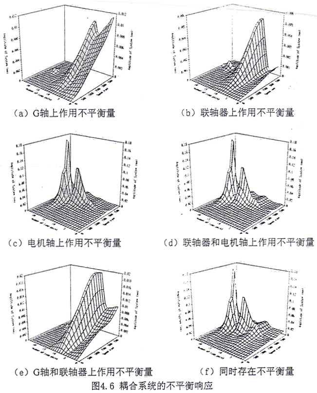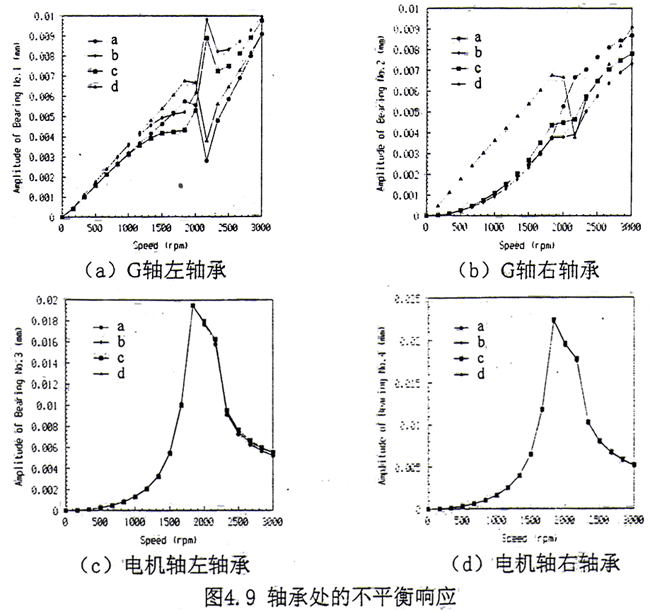 (2)分別在G軸、齒輪聯(lián)軸器和電機(jī)軸上存在不平衡量,計(jì)算了耦合系統(tǒng)的不平衡響應(yīng)。計(jì)算結(jié)果見圖4.6a~4.6c。