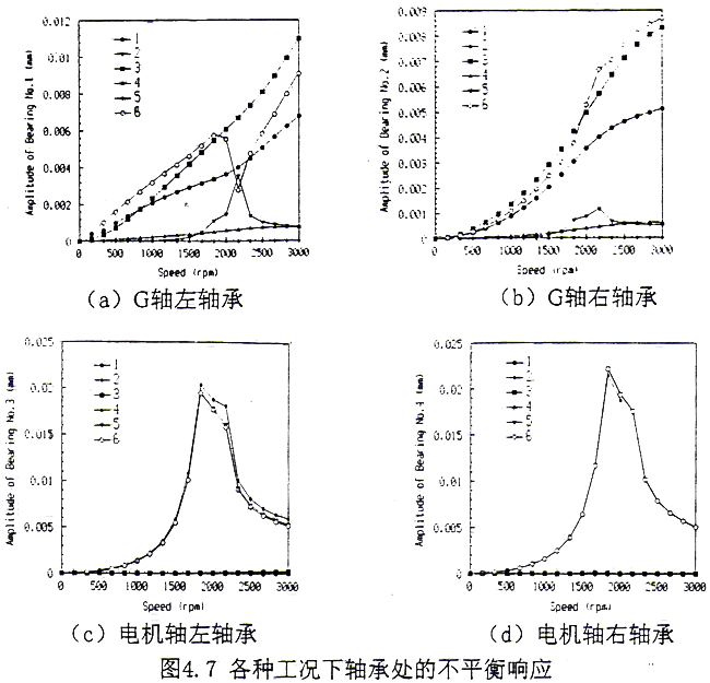 比較圖4.5a和4.6a可見,同樣在G軸的大齒輪上存在不平衡量,單軸和耦合系統(tǒng)所產(chǎn)生的響應(yīng)卻有較大的差別。用單個G軸計(jì)算,從G軸的左端開始到右軸承不平衡響應(yīng)幅值變化比較平緩,隨后迅速增大,在外伸端達(dá)到最大值;而用耦合系統(tǒng)來計(jì)算,則在G軸的左端振幅最大,比用單個G軸計(jì)算所得值在同一位置高得多,隨后迅速減小,在G軸的右軸承處振幅最小,之后又迅速增大,在外伸端達(dá)到一極值,但比用單個G軸所得值小,這一特點(diǎn)表明,耦合后G軸外伸端的不平衡響應(yīng)受到一定程度的抑制;從圖4.6b可知,聯(lián)軸器的不平衡量對本身的振動產(chǎn)生較大的影響,對G軸左右軸承的影響較小,當(dāng)然這與聯(lián)軸器的不平衡量密切相關(guān),如果聯(lián)軸器的不平衡量較大,則另當(dāng)別論;由圖4.6f可見,在G軸、聯(lián)軸器和電機(jī)軸上同時存在不平衡量時,在工作轉(zhuǎn)速下,聯(lián)軸器處的響應(yīng)幅值很大,與圖4.6b相比可知,聯(lián)軸器處的振動是G軸、聯(lián)軸器本身和電機(jī)軸三處不平衡力綜合作用的反應(yīng),聯(lián)軸器處振動過大對其可靠運(yùn)行帶來不利。另外比較圖4.5和圖4.6可知,電機(jī)軸的不平衡響應(yīng)主要是由電機(jī)軸自身的不平衡造成的,G軸和聯(lián)軸器的不平衡對其影響很小。從圖4.7可見,僅在G軸上作用不平衡力,當(dāng)轉(zhuǎn)速超過1000(rpm)后,用耦合系統(tǒng)計(jì)算所得G軸軸承上的振幅明顯大于用單個G軸所得值,而且隨轉(zhuǎn)速增大,變化越明顯。在工作轉(zhuǎn)速下,二軸承處的振幅前者分別是后者的1.60倍和1.66倍,這表明用單個G軸計(jì)算G軸二側(cè)軸承的不平衡響應(yīng)是不安全的,而且實(shí)際測量[18]的結(jié)果確實(shí)要比計(jì)算所得的值要大得多。另外,在軸承處的不平衡響應(yīng),只要是用耦合系統(tǒng)進(jìn)行計(jì)算,那么在非共振區(qū)各轉(zhuǎn)子的不平衡只對本身所所在二個軸承的振幅起決定作用,而對另二個軸承影響不大。這反映了在一般情況下,一側(cè)轉(zhuǎn)子的不平衡所引起的振動通過聯(lián)軸器而傳遞到另一側(cè)的振動較小,這也正是齒輪聯(lián)軸器被廣泛采用的另一個優(yōu)點(diǎn)。