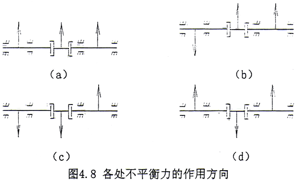 在實(shí)際系統(tǒng)中,不平衡力的作用方向是無法預(yù)知的,不妨設(shè)系統(tǒng)不平衡力的作用方向分別如圖4.8a~4.8d所示。各處不平衡量同上。計(jì)算了在3處同時具有不平衡力,耦合系統(tǒng)的不平衡響應(yīng)。結(jié)果見圖4.9a~4.9d。從中可以看出,不平衡力作用方向的不同對G軸兩側(cè)的支承軸承有一定的影響,但影響不大,對電機(jī)軸兩側(cè)的支承軸承則幾乎沒有任何影響。