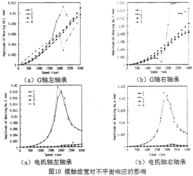 圖4.10a~4.10d表示了接觸齒寬對不平衡響應(yīng)的影響。圖中符號:1—耦合系統(tǒng)在3處同時作用不平衡力(全齒寬接觸),2—耦合系統(tǒng)在G軸上作用不平衡力(全齒寬接觸),3—耦合系統(tǒng)在3處同時作用不平衡力(接觸齒寬為小量),4—耦合系統(tǒng)在G軸上作用不平衡力(接觸齒寬為小量)。從圖中可見,在非共振區(qū)接觸齒寬b對G軸上靠近聯(lián)軸器的右軸承影響較大,對其它軸承的振動影響要小得多。這實(shí)際上反應(yīng)了電機(jī)軸對G軸耦合程度的增加。